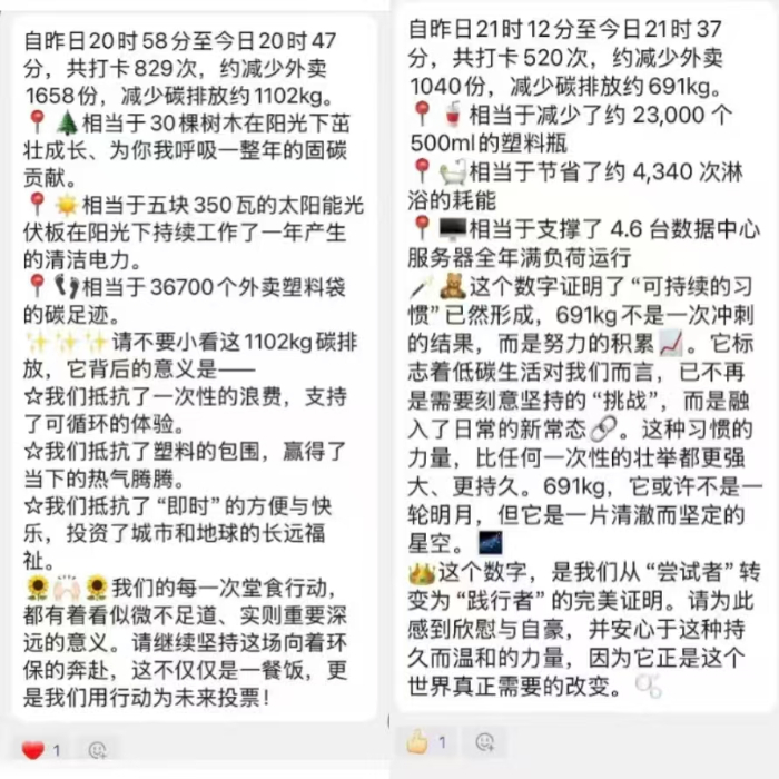 一、创新活动形式,理念倡导与行为引导并重面对高校普遍存在的外卖依赖与餐饮浪费问题,本次活动旨在通过持续的集体实践,探索行为改变的可行路径。活动设计了兼具趣味性与挑战性的打卡机制,将抽象的环保理念转化为“每日堂食+光盘”的具体行动,让参与者在亲身实践中感知绿色生活方式的实质内涵。