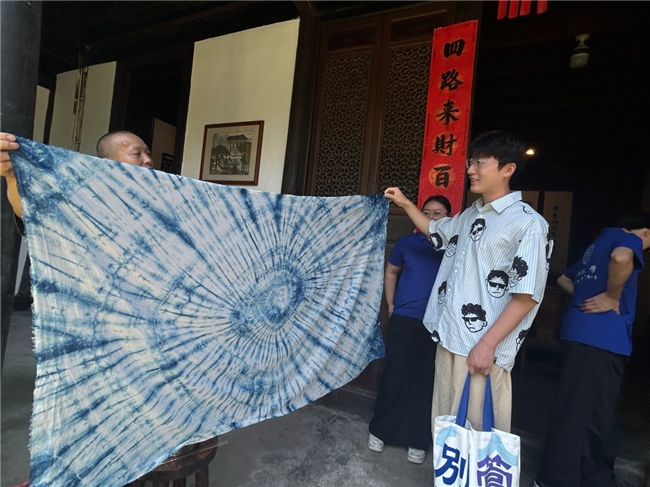 “咔嚓、咔嚓”,紫洪山村百年台门下,非遗传承人把一捆靛蓝扎染布投入染缸,布面瞬间开出“冰裂纹”。成员们来到紫洪山村,团队拜访植物扎染非遗传承人姜老师工作室,全程观摩植物染料制作与扎染工艺,感悟传统技艺的环保理念与当代价值。成员们还走访古台门建筑,触摸历史文脉,探索“文化+旅游”融合发展的创新路径。