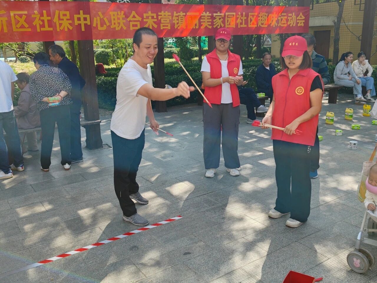 一旁的投壶区域内更是充满欢乐,居民手持箭矢,对准壶口,箭支在空中划出轻巧轨迹,周围响起阵阵喝彩;趣味套圈区里,居民们紧盯心仪物品,手腕轻扬间,圈圈划出优美弧线。