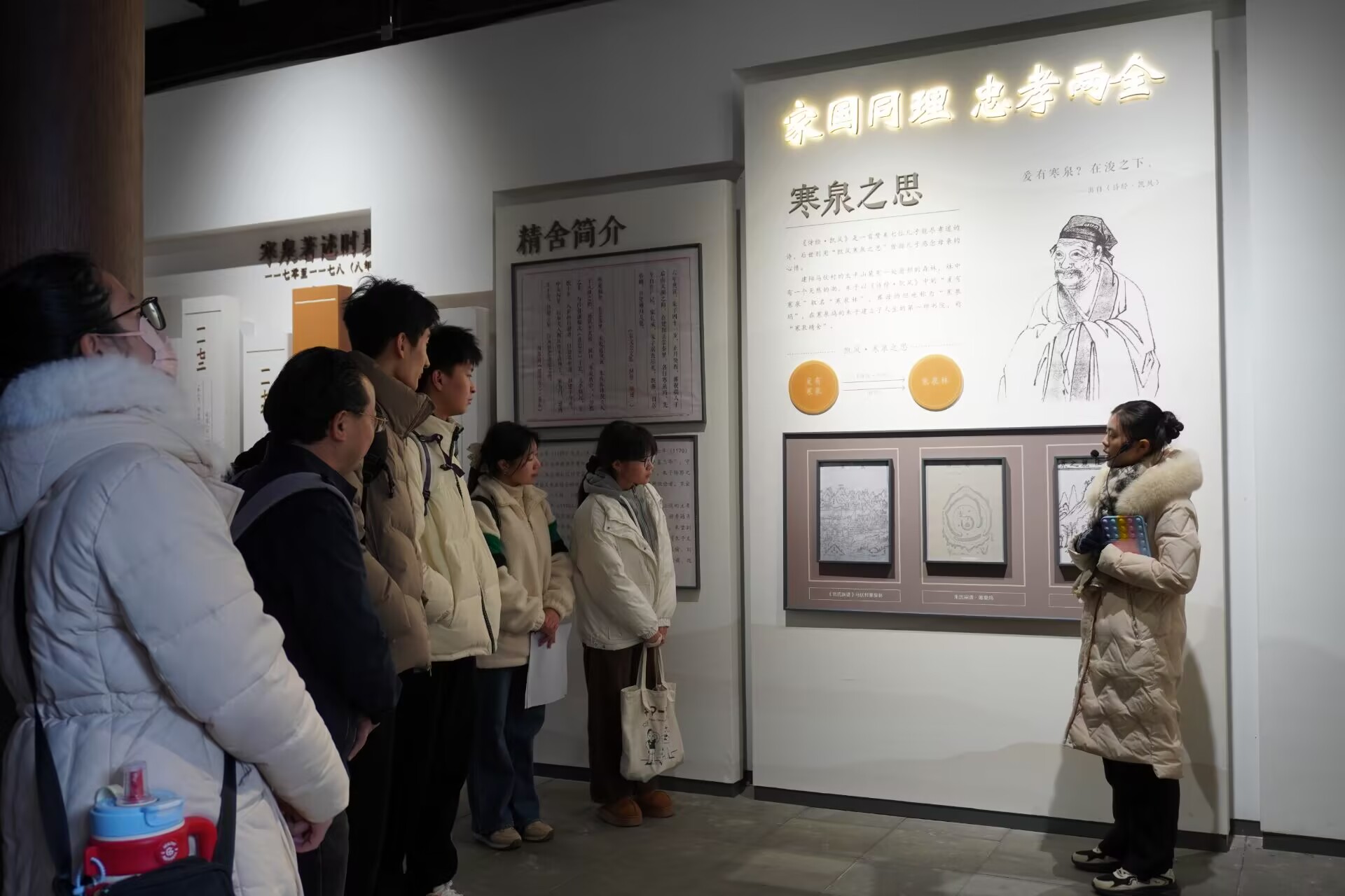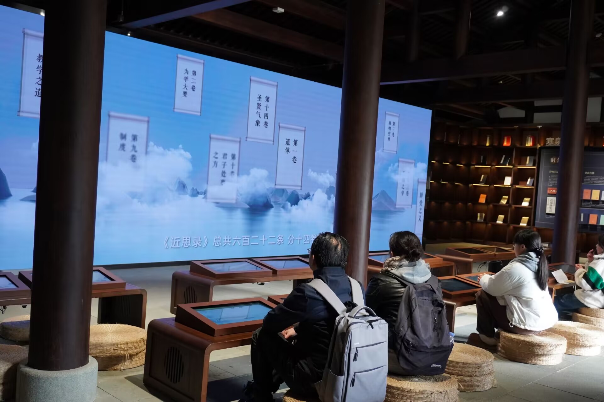 在藏书阁和寒泉精舍主展厅,队员们体验到了现代科技与传统文化的创新融合。场馆内嵌多媒体设备,打造了数字化的沉浸式课堂。通过高清影像与交互装置,生动再现了朱熹与吕祖谦等好友共读经典、合作著述《近思录》的历史场景。数字技术让八百年前的学术合作变得栩栩如生,队员们仿佛亲临现场,目睹理学道统的确立过程。讲解员特别指出,这种合作著述的模式体现了理学开放包容的学术精神,为后世学子确立了治学典范。创新的展示方式不仅增强了参观的趣味性和互动性,更让年轻学子在沉浸式体验中加深对理学传承脉络的理解。