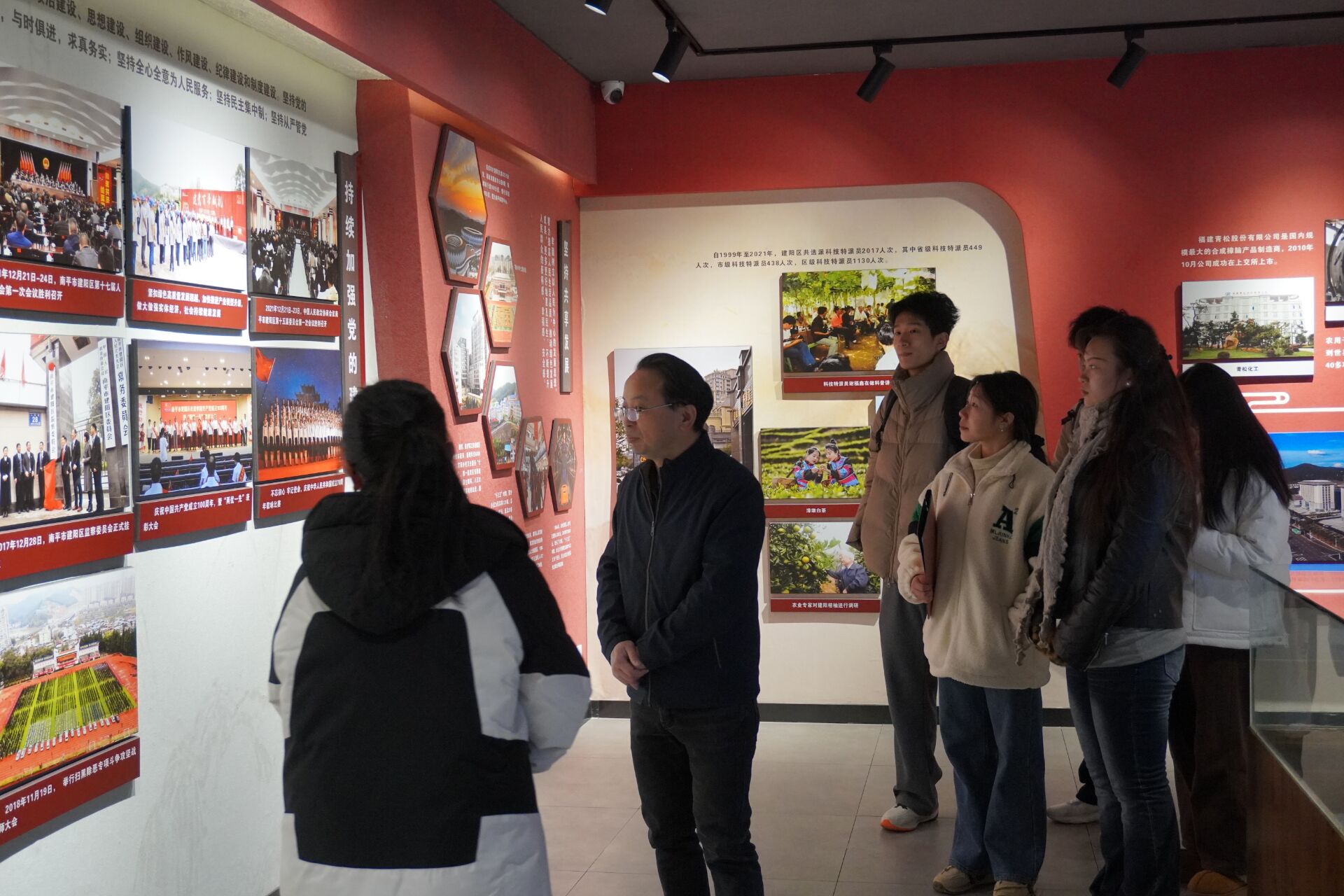 实践队随后移步二层,参观了第三至第五部分。第三部分“社会主义建设和探索中前行”与第四部分“改革开放 争创小康”,通过历史照片与年表,清晰展现了建阳在新中国建设与改革浪潮中的发展足迹。第五部分“走绿色发展之路 全面建设小康社会”则聚焦新时代,展示了当地践行“市区一体、绿色发展”思路,全方位推动高质量发展的新画卷。
