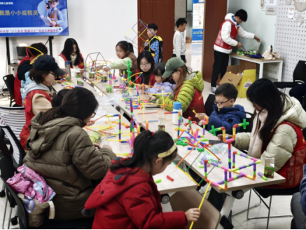 图为志愿者指导小朋友拼接管道模型陈成摄