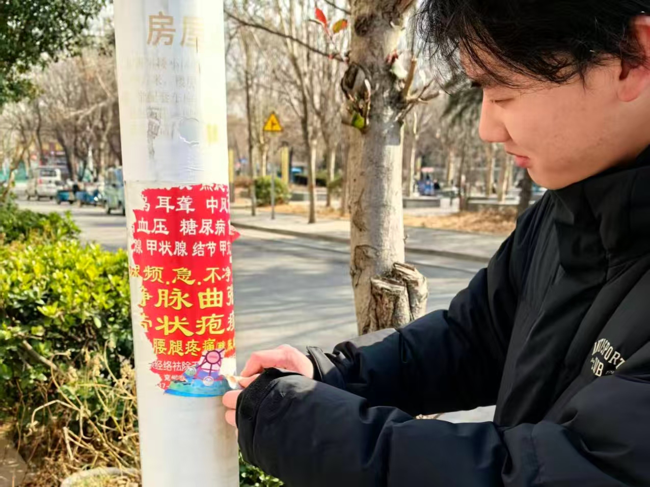 针对墙面、电线杆上的小广告 “顽疾”,成员们携带铲刀、喷壶等工具,耐心细致地进行清理,恢复社区公共设施的整洁面貌。