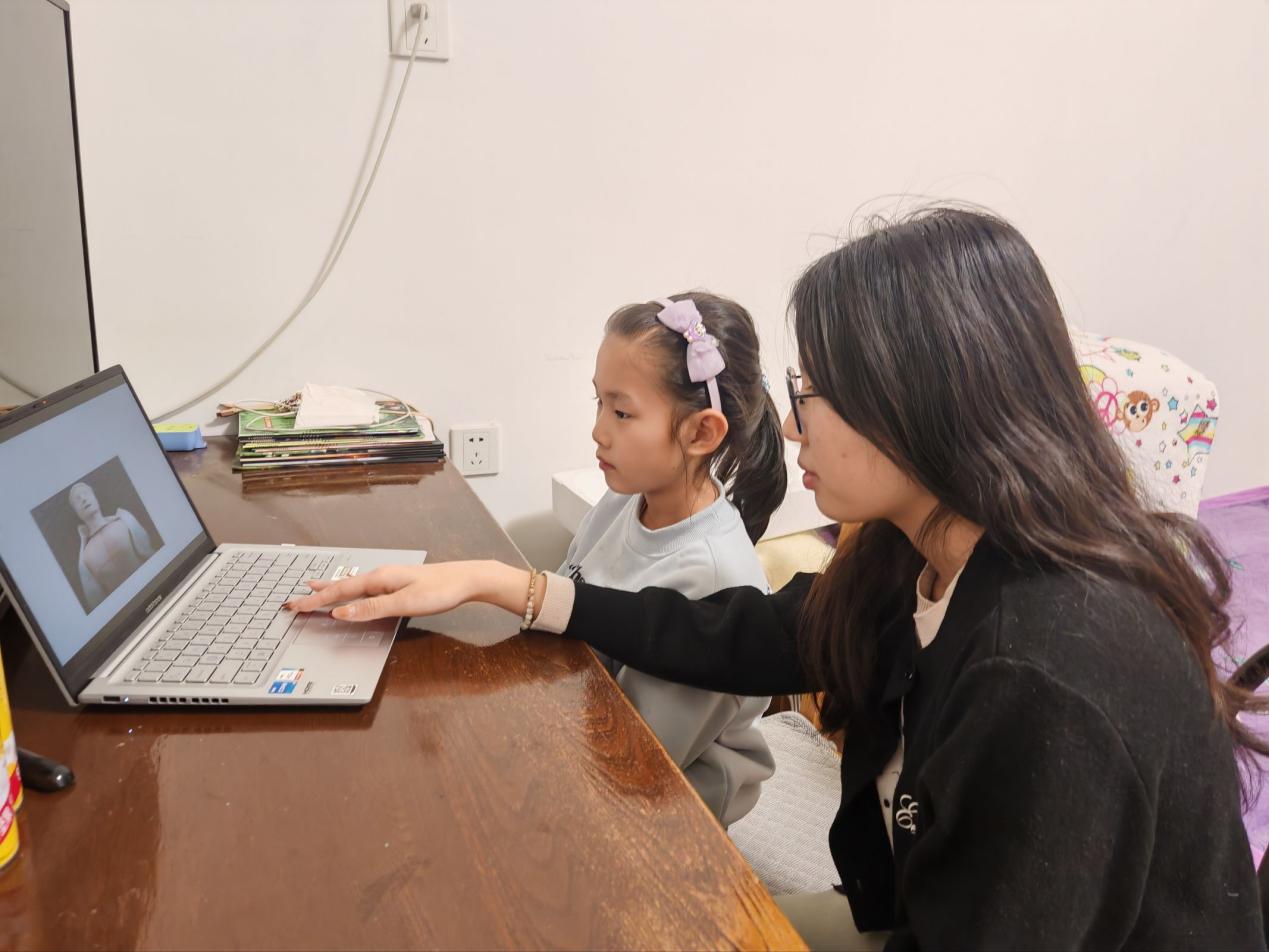 考虑到寒假期间家庭聚会增多、儿童意外风险升高,纪丹阳结合专业知识将心肺复苏急救技能培训作为此次实践的重点内容。她结合护理专业知识,用通俗易懂的语言为孩子们讲解心肺复苏的重要性、适用场景及操作原理,通过模型演示清晰展示胸外按压的位置、力度与频率,细致拆解开放气道、人工呼吸的标准流程。为了让孩子们更好理解技能,纪丹阳着重强调操作中的关键细节与安全注意事项。孩子们在实践操作中牢记急救要点,应对突发情况的自救互救能力得到显著提升,也树立了“安全第一、科学施救”的责任意识。
