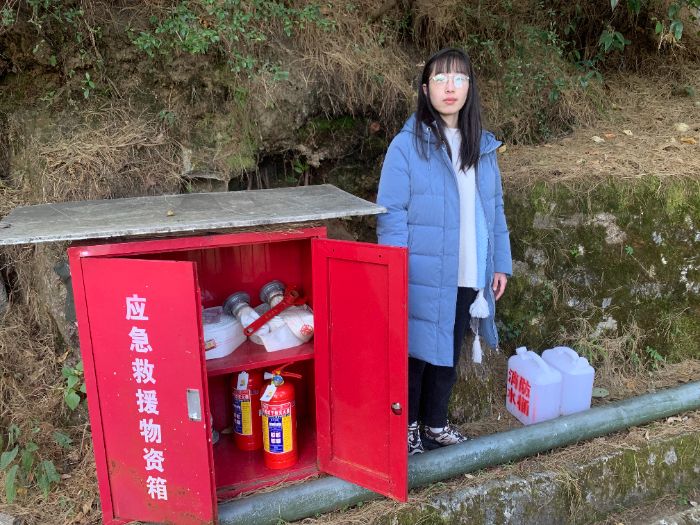 在实践过程中,程奥婷系统学习了森林防火的专业知识,从火灾成因、预防措施到应急响应流程,进行了全面了解。理论学习之外,她更注重亲身实践。在护林员的指导下,她积极参与步道沿途的火灾隐患巡查,认真检查并维护森林消防设施。她跟随当地护林员,沿古道步道进行常态化巡护,排查火灾隐患。在崎岖的山路上,将消防水桶搬运至预设的储备点,以保障应急水源的就近可用。同时,她逐一检查步道沿线设置的应急救援物资箱,仔细核对箱内灭火器具、应急工具是否齐全完好,并按要求进行记录与简单维护。这些具体操作让她将课堂所学与实地需求紧密结合。这些具体而微的工作,让她深刻体会到森林防火无小事,每一份细致的准备都是对绿水青山最坚实的守护。