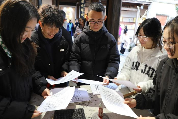 实践队走进全国家庭教育创新实践基地——三坊七巷名人家风家训馆,沉浸式感悟闽都家风精髓。队员们细读蔡襄“忠惠勤廉谨,风范传家远”的处世之道,体悟林则徐“苟利国家生死以”的家国情怀,领会严复家风家训“治学、齐家、爱国、奉公”的精神内核。为使陈列于展柜中的古老智慧“活”在当下,实践队队员棕刷蘸墨、宣纸覆板,亲手拓印林则徐家训《十无益》,让静态文字在指尖晕染成可触可感的文化载体。这一“墨香对话”,既传承了三坊七巷名人“开风气之先 谋天下永福”修齐治平的显著精神特质,又以“非遗+家风”模式实现传统文化的当代表达,为家风建设注入青春创意。