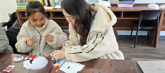 终于到了亲手创作的时刻。白色的面具、斑斓的颜料、纤细的画笔,在孩子们手中化作了表达自我的语言。有的孩子以朱砂为底,勾勒出心中忠义英雄的轮廓;有的大胆泼洒靛蓝,晕染出侠肝义胆的风骨;还有的用墨色勾勒眉眼,让脸谱在指尖生出独特的灵魂。支教老师俯身指导,指尖轻触,便有了线条的流转;耐心点拨,便有了色彩的交融。教室里,颜料的清香与孩子们的笑声交织,每一张完成的脸谱,都是独一无二的文化印记,承载着他们对非遗的理解与热爱。