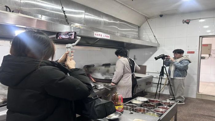 图注:队员在新发饭店拍摄黄河古道鲜鱼汤炒料环节特写