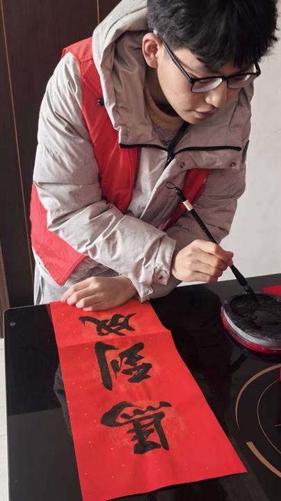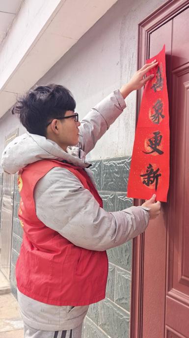 2522107143团支部束一凡同学在便仓镇社区居民家门口张贴对联-王成风本次寒假社会实践活动:书写并张贴春联活动,既是服务也是学习,志愿者们在挥毫泼墨间感受中华传统文化的魅力,在为邻里送上新春祝福的过程中体会到“年味”里的温情,深刻感悟到传统文化在当代社区生活中的鲜活生命力。写春联、贴春联是一件充满意义的事,对社区居民而言,它是感受传统年味、收获新春祝福的暖心时刻;对社区而言,它是营造邻里和睦、传承中华优秀传统文化的重要纽带。在服务过程中,志愿者的自我能够得到提高、完善和发展,精神和心灵能够得到满足。写春联、贴春联既是“赠人墨香”,亦是“自我成长”,既“暖人”,也“暖心”。