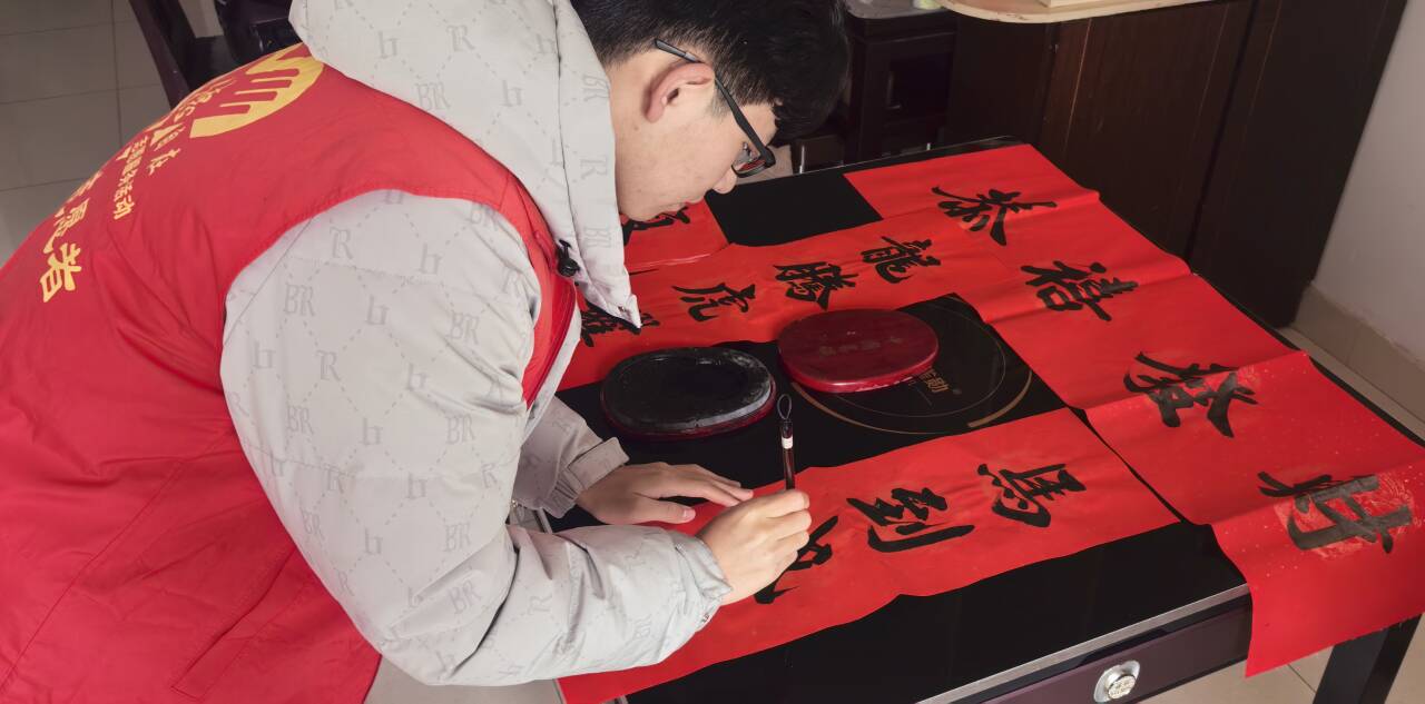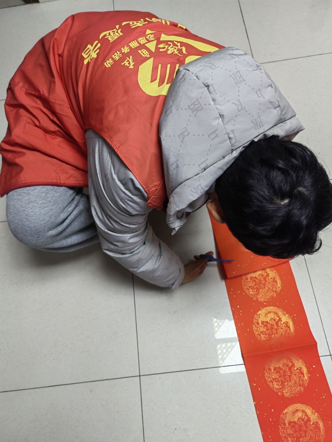 2522107143团支部束一凡同学在盐城市亭湖区便仓镇富民社区中心书写对联-王成风2月10日上午盐城市亭湖区便仓镇富民社区让志愿者们带好昨天写好的对联,由社区工作人员带志愿者们挨家挨户拜访。如家里有老人,就热情地送上社区提供的暖心年货。我们志愿者们拿出,让居民们挑选自己喜爱的,由我们志愿者负责为居民们张贴对联。待所有对联都发送完毕后,我们志愿者便邀请便仓镇上的居民们一起合照留影,增添喜悦气氛。