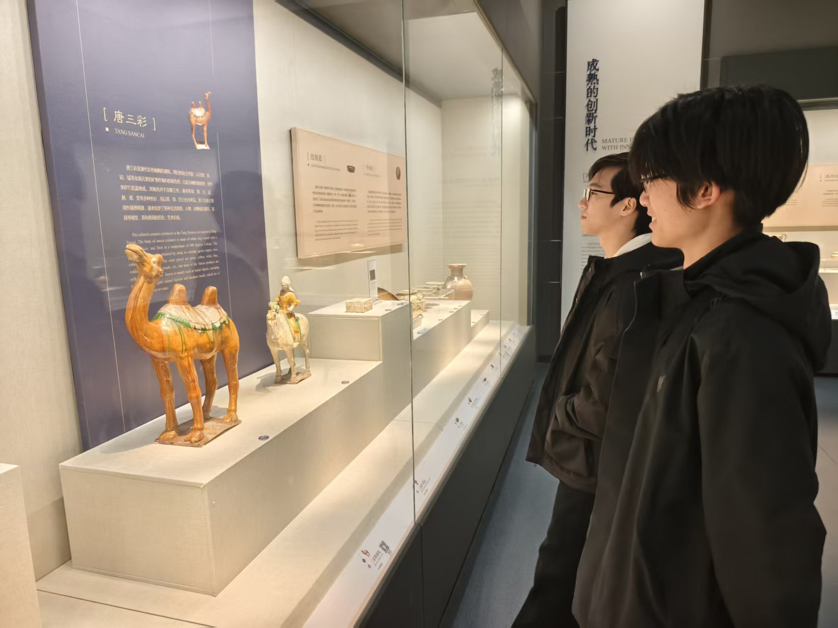 在唐代文物展区,色彩斑斓的唐三彩吸引了众人的目光。作为唐代陶瓷艺术的杰出代表,唐三彩以黄、绿、褐三色为主,造型生动、图案精美,生动再现了唐代的社会风貌与审美情趣。同学们通过实物与图文介绍,进一步理解了唐三彩的历史价值与艺术内涵,也对唐代文化有了更直观的认识。