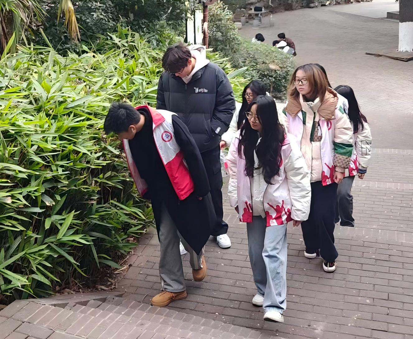 随后,团队沿着蜿蜒的石阶步道开启“地毯式”巡查。从石缝中卡住的烟蒂,到草坪上散落的碎纸屑,队员们用双脚丈量土地,用双手还原美景。他们将理工科严谨细致的作风带入环保实践,这种“绣花功夫”般的精细作业,引得路过的晨练老人连连点赞:“这些大学生伢子是真干活,不是来作秀的!”