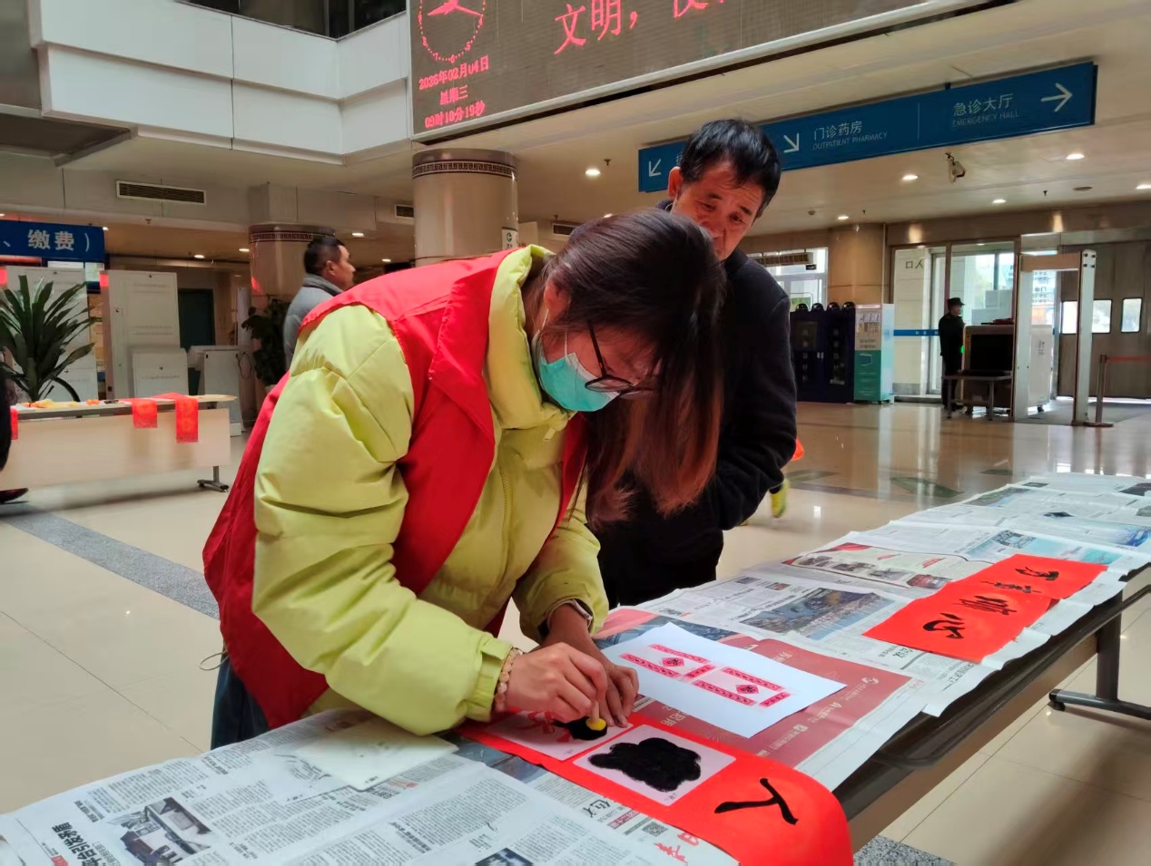 活动现场暖意融融,志愿服务的红色身影成为医院里一道亮丽的风景线。在医院门诊大厅,我校志愿者们化身 “新春福使”,参与写春联、剪福字活动。大家伏案挥毫、巧手翻飞,将满满的新春祝福融入笔墨与剪刀之间,一幅幅寓意吉祥的春联、一个个精致喜庆的福字,经由志愿者之手送到就诊患者及家属手中,为忙碌的就医环境增添了浓厚的年味。
