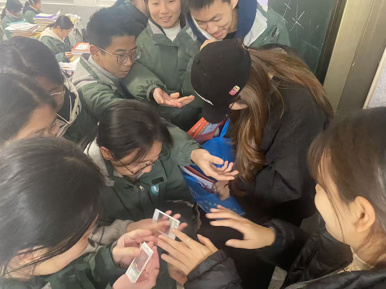 活动现场,团队成员手持校园风景透卡与高中师生合影留念,定格下温暖的青春瞬间。为增强活动趣味性与参与感,团队还开展了随机抽奖环节。幸运同学获得了精心准备的文创礼品,轻松活跃的氛围让同学们在欢乐中进一步了解浙财东方。这份对大学生活的美好向往,成功转化为冲刺高考的内生动力,显著提升了同学们学习的积极性与主动性。