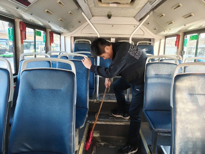 公交场站车辆往来频繁,运营后的车辆地面常会残留泥沙、纸屑等杂物,座椅下方、车门踏步等卫生死角更易积攒垃圾,实践团成员便手持小扫帚仔细扫出缝隙碎屑。