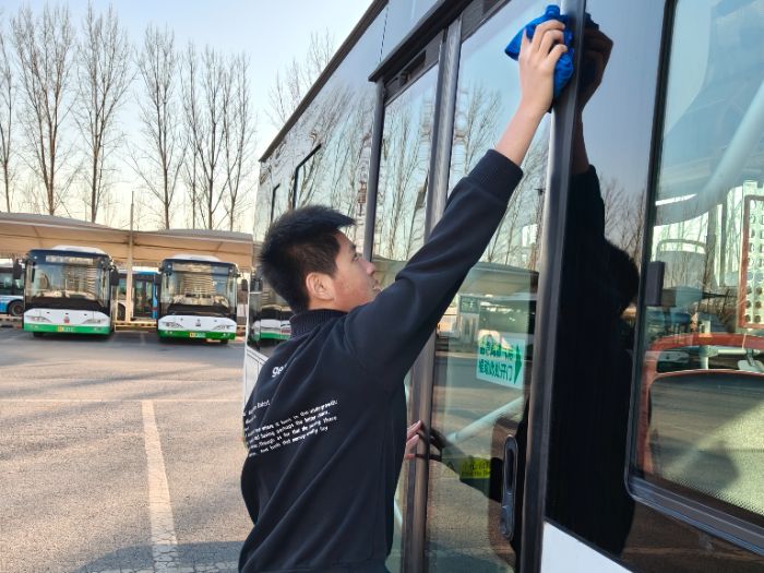 实践期间,实践团成员的工作核心为公交车厢地面卫生清理与车辆基础护理,每一辆待清洁车辆,他都遵循从车外到车内顺序开展作业。