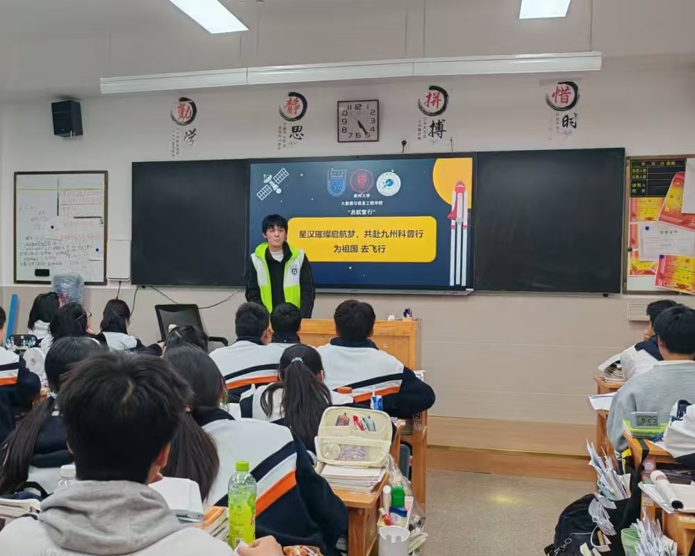 2026年1月18日,正值寒冬时节,贵州师范大学附属中学的教室里却座无虚席、气氛热烈,一场以“逐梦航天,强国有我”为主题的航天爱国实践宣讲活动在这里顺利开展。本次活动由贵州大学大数据与信息工程学院的青年志愿者团队走进附中校园,通过专题分享、视频展播、互动问答等多种形式,为附中学子带来了一场兼具科学性与思想性的航天爱国教育盛宴,让航天精神与家国情怀在青少年心中生根发芽。