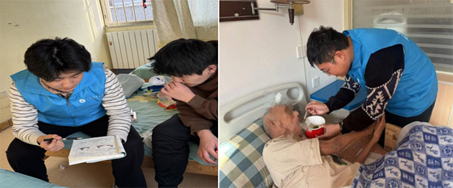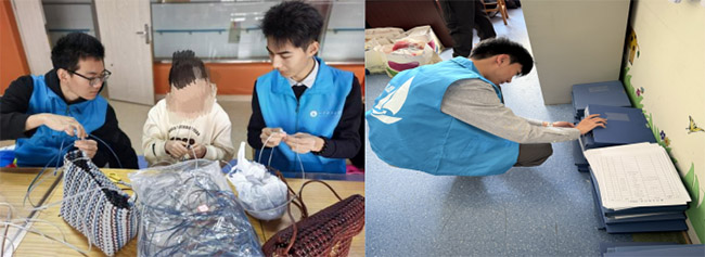 躬身实践暖童心,深耕细作伴成长 初入福利院,队员们迅速完成部门分配与工作对接,以最快的速度融入福利院的日常工作。在儿童部,队员们化身暖心老师,开展课业辅导、陪伴谈心,用耐心与温柔守护童真;在老人部,他们践行敬老爱老传统美德,悉心照料老人生活、陪伴闲话家常,以点滴行动温暖桑榆;在精神残疾部,队员们发挥特长开展朗诵授课,参与工疗手工、协助日常服务,在双向陪伴中传递温情。从档案整理到课业辅导,从生活照料到手工协作,队员们在不同的岗位上各司其职、尽心尽力,将青春的热情与活力融入福利院的每个角落,用实际行动诠释新时代青年的责任与担当。那些俯身讲解的身影、耐心喂饭的模样、携手创作的瞬间,都化作冬日里最暖的光,照亮了福利院的方寸天地,也让彼此的心灵紧紧相依。