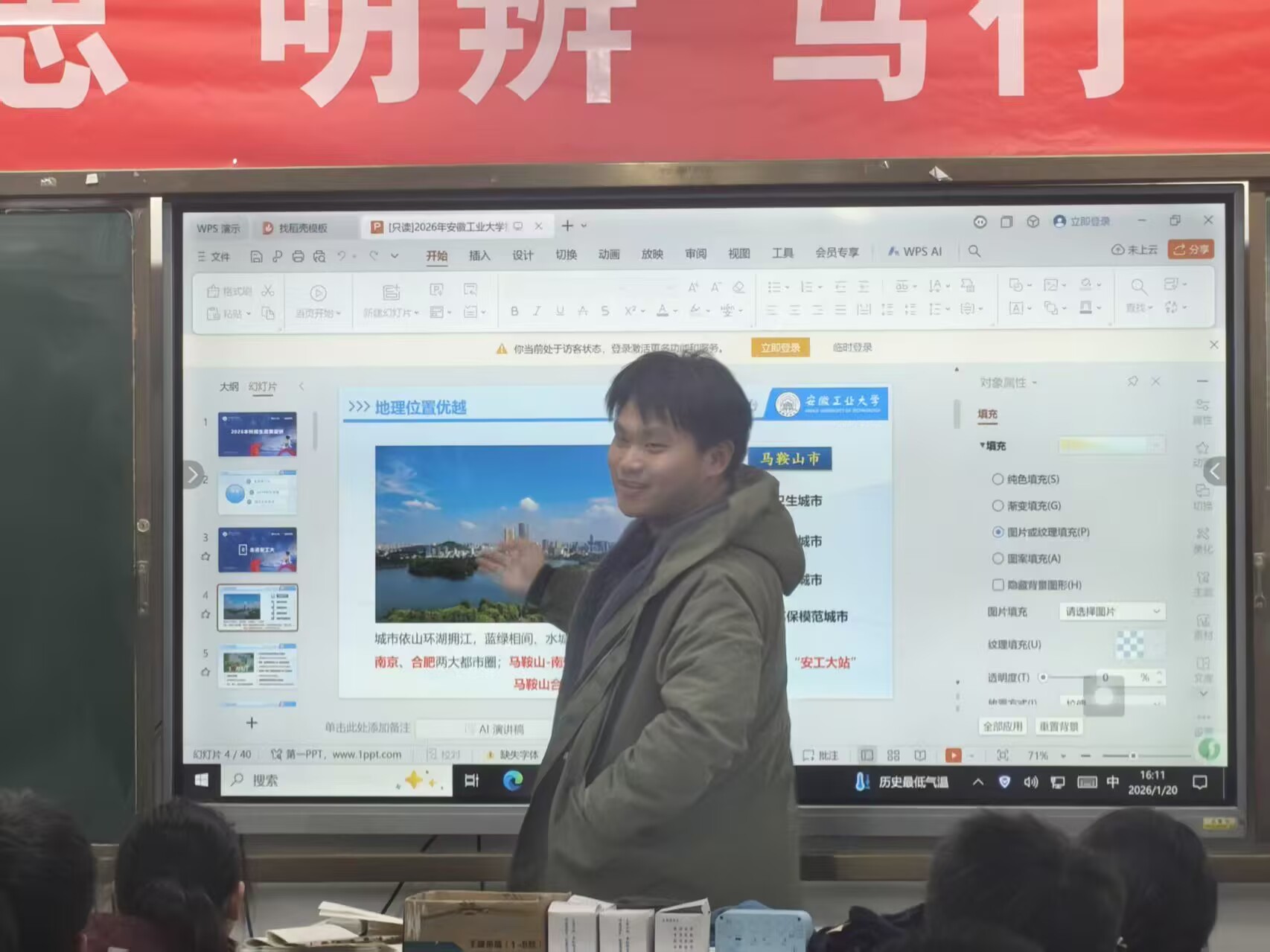 安徽工业大学“我把工大带回家”实践队员朱锦辉同学进入滁州凤阳英华中学向高三年级同学开展宣讲。在滁州凤阳英华中学的宣讲会上,实践成员朱锦辉同学以“我的大学,我的成长”为主题结合PPT,介绍了马鞍山的地域特色景点和美食,分享了在安徽工业大学的学习生活体验和心路历程,详细讲解学校专业与人才培养。