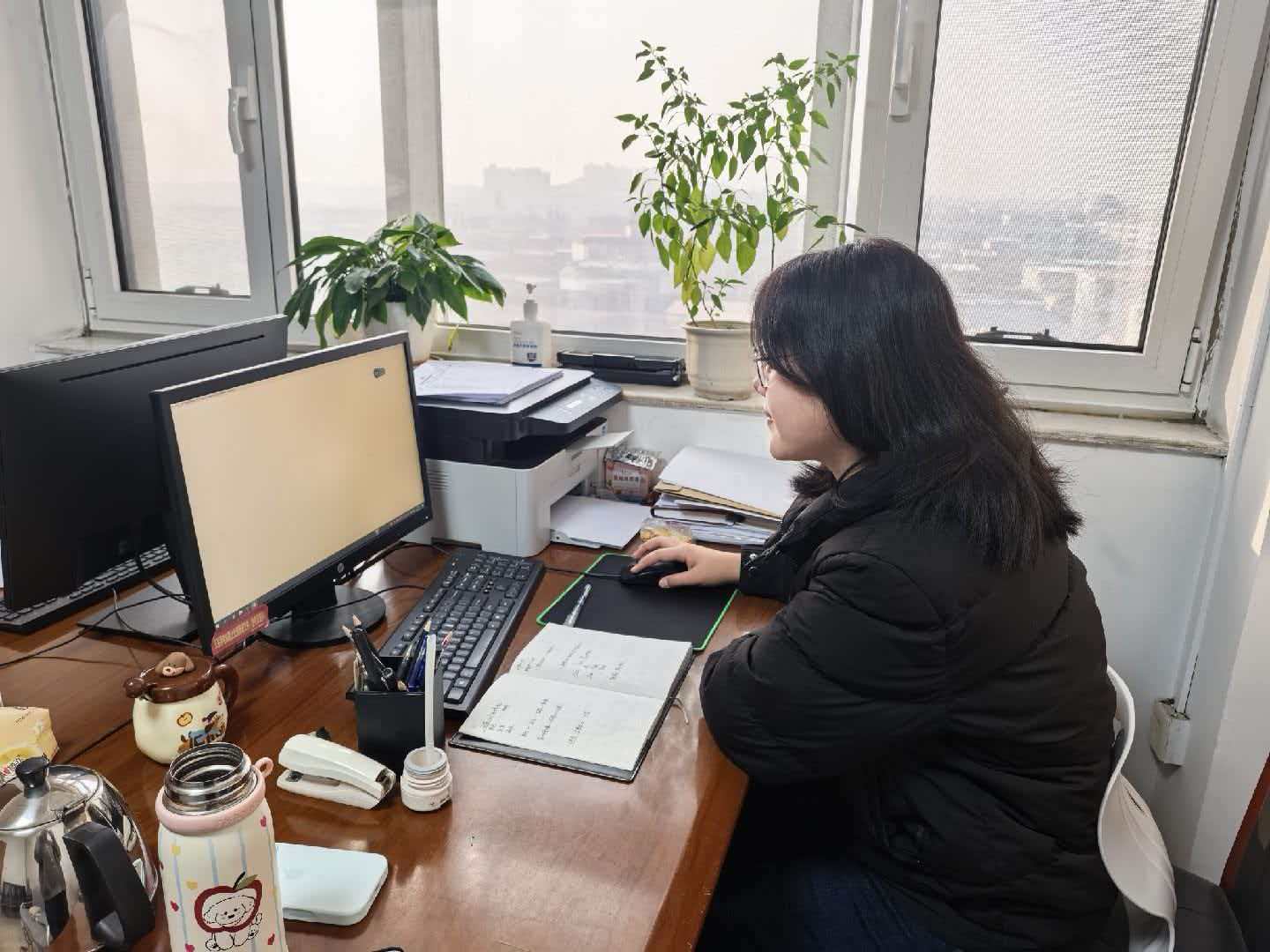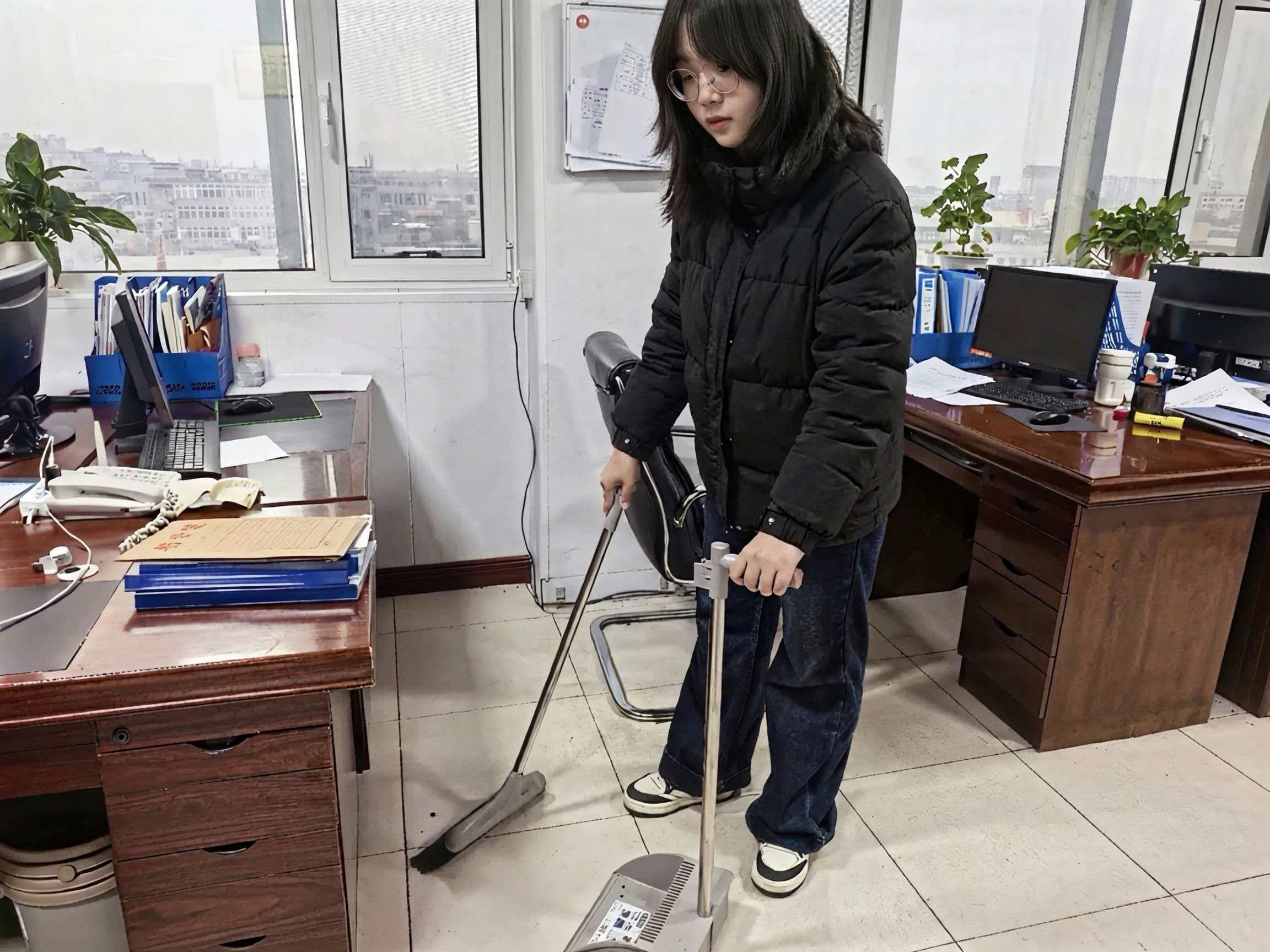 图为实践团成员每日办公前半小时,实践团成员会提前到岗,整理办公区域:擦拭桌面灰尘、归置散落的文件与办公用品,确保工位整洁有序;在办公间隙,主动承担公共区域清洁工作,维护办公环境。
