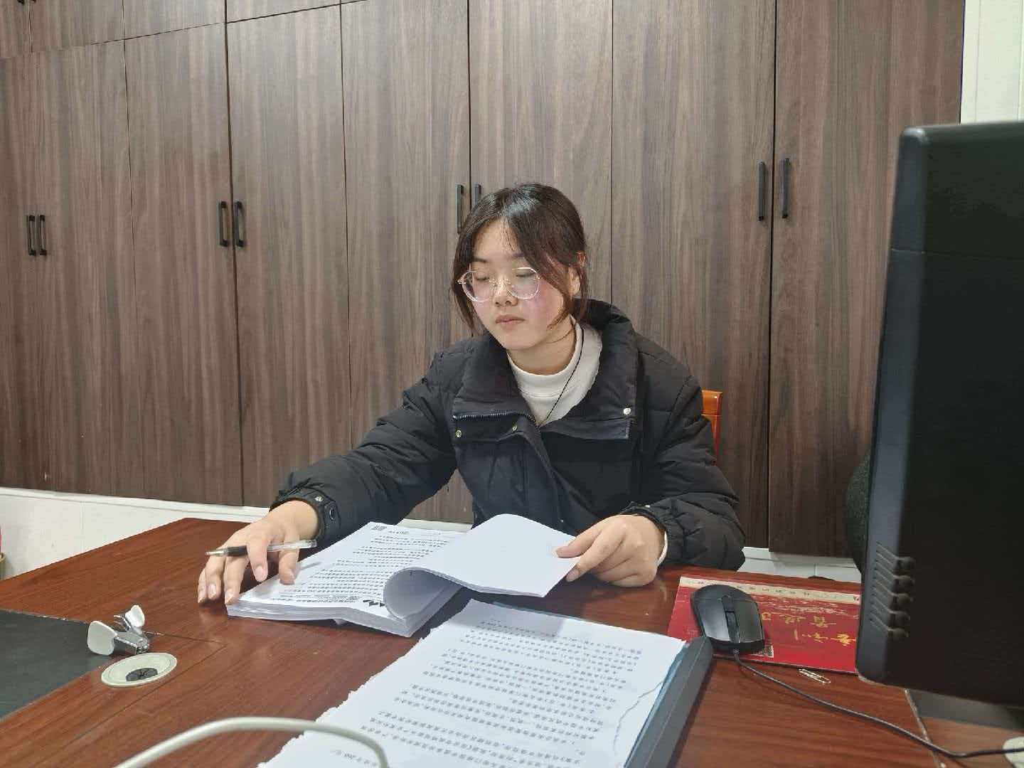图为实践团成员整理行政文件资料办公结束后,实践团成员并未立即离开,而是留下按顺序整理当日文件,将各类资料按类别收纳进档案盒,同时检查文件数目是否齐全。