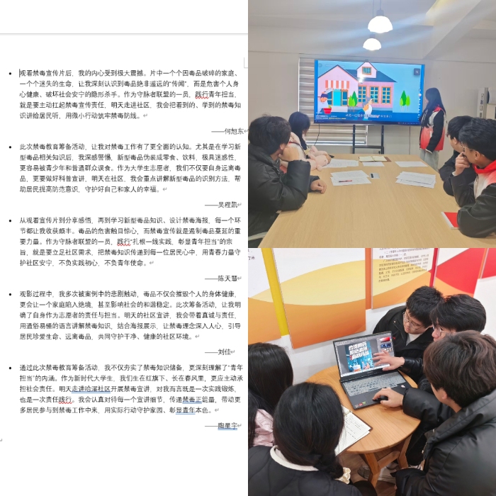 禁毒宣传是守护社区平安的重要举措。为做好后续宣讲工作,实践队首先开展专项禁毒教育筹备活动。队员们集中观看禁毒宣传片,通过真实案例直观感受毒品对个人、家庭和社会的严重危害,深刻认识到禁毒工作的紧迫性与重要性。观影结束后,队员们踊跃发表感言,分享内心触动,纷纷表示要以实际行动传递禁毒理念。随后,大家围绕新型毒品展开系统学习,细致了解其种类、伪装形式及识别方法,重点梳理易被青少年忽视的禁毒误区,结合社区居民特点整理宣讲重点。学习结束后,队员们分工协作,精心设计禁毒宣传海报,以鲜明的色彩、简洁有力的标语将禁毒知识融入设计之中,为后续宣讲筑牢基础。
