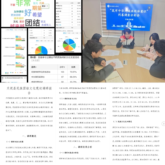民族团结是社区发展的根基。实践队以“铸牢中华民族共同体意识”为核心,在社区开展主题宣讲,讲述天祝县多民族共生共荣的历史与邻里互助的暖心故事,让“中华民族一家亲”理念深入人心。在此基础上,实践队重点推进线上民族团结文化调研。队员们精心设计科学问卷,围绕民族认知、文化交往、政策了解等维度设置问题,通过多种线上渠道广泛发放,全面收集当地群众对民族团结文化的认知与感受。问卷回收后,团队第一时间召开分析会议,队长何旭东主持会议并发言,他结合调研数据指出:“从反馈来看,各族群众对民族团结的认同感很高,但在文化交往深度上仍有提升空间。”队员们分工协作,深入挖掘数据背后的亮点与不足,最终立足天祝实际撰写完成民族团结文化调研报告,为当地相关工作提供参考,助力各民族交往交流交融。