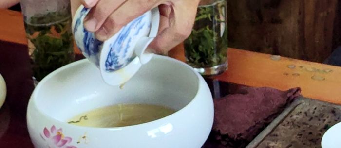 品茶环节中,瑞草园尹经理将成员们自制的绿茶倒入玻璃杯冲泡,直观的对比令人印象深刻:炒制时间较长的绿茶,汤色偏深且变色更快,入口也更显苦涩。“这正是工艺对品质的直接影响,”尹经理结合专业评审知识讲解道,“炒得太久会让茶叶中的茶多酚过度氧化,不仅影响色泽,也会增强苦涩味。”