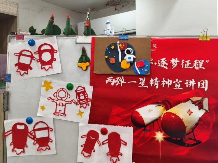 图为孩子们创作的“两弹一星”主题粘土模型和剪纸作品墙展示 孩子们带着满满的收获来到成果展示环节。他们自豪地展示着自己的作品,向大家讲述创作背后的故事。每一个作品都凝聚着孩子们的心血和对“两弹一星”精神的理解。宣讲团成员对孩子们的作品给予了高度评价,鼓励他们继续传承和弘扬“两弹一星”精神,在未来的生活中不断追求卓越。