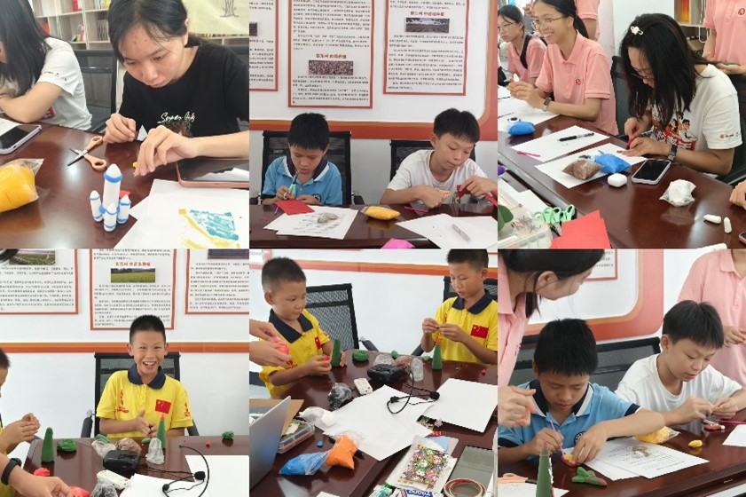 图为孩子们在宣讲团成员引导下,热情投入“两弹一星”主题创意粘土制作活动