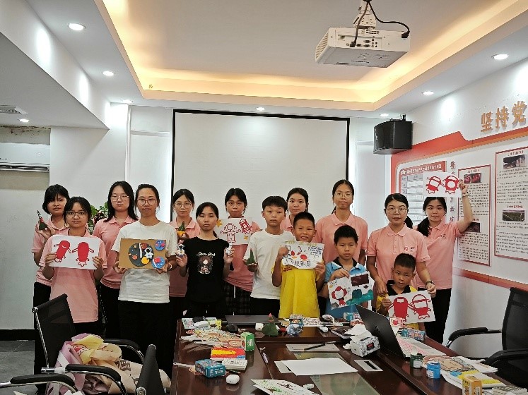 图为参与结营活动的孩子们、宣讲团成员在作品展示环节合影留念