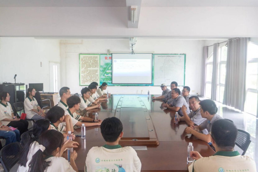 实践团抵达后,首先与污水处理厂张厂长开展交流。张厂长结合厂区规划图与运营数据,系统介绍了厂区整体建设情况——作为钦州市重要的污水处理设施,该厂设计处理规模、服务区域覆盖范围明确,采用的主体工艺技术成熟可靠,可有效去除生活污水中的有机物、悬浮物等污染物,处理后的尾水达到一级A排放标准,对改善钦江流域水质起到重要支撑作用。