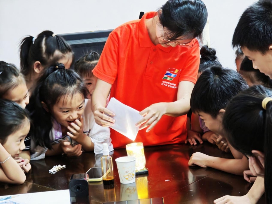 图为团队成员为小朋友做化学小实验