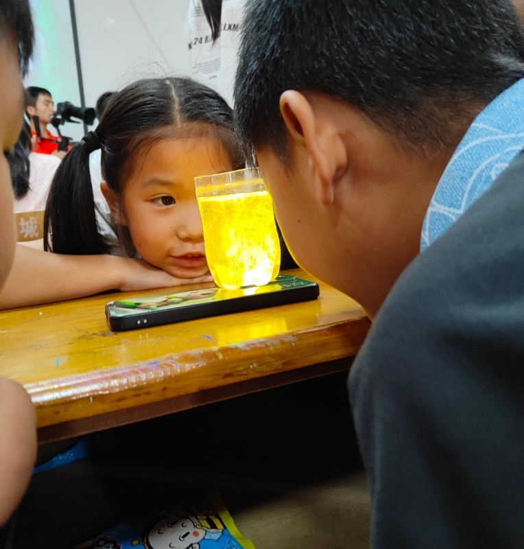 “看,水里有黄色光带!”幽暗灯光下,成员们用手机照射装有维生素B2溶液的容器,无色水体中瞬间绽放出梦幻的黄色光带,如流星般在水中游弋。孩子们眼眸中闪烁着好奇,不时发出惊叹。