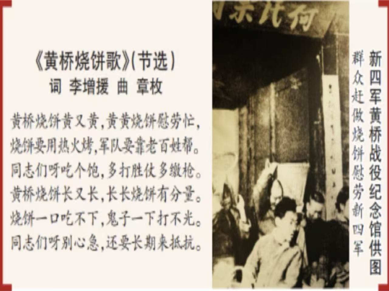 “烧饼传递的不仅是食物,更是民心。”团队成员感慨道。战役期间,黄桥镇呈现“家家无闲人,户户做烧饼”的壮景:老人揉面、妇女烧水、儿童捡柴,青壮年穿越火线送饼。一首黄桥烧饼歌由此诞生:“黄桥烧饼黄又黄,黄黄的烧饼慰劳忙,烧饼要用热火烤,军队要考老百姓帮。同志们呀吃得饱,多打胜仗多缴枪”,歌词道出了军民鱼水情的真谛。新四军战士捧着百姓手制的烧饼,士气大振,最终以少胜多,奠定了苏北抗日根据地的基础。