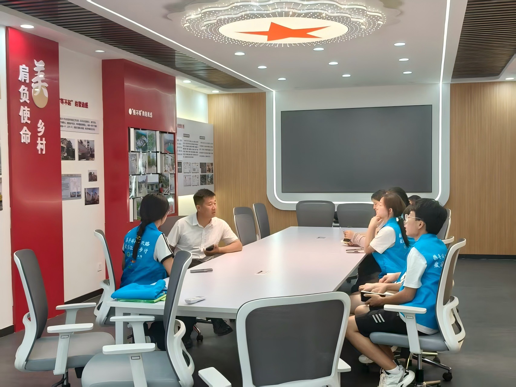 图为队员在白马石文化遗产馆通过直播结合非遗展品讲解当地红色故事。刘嘉锋供图调研献策:在需求导向中找准教育坐标实践队与当地负责人在白马石社区开展调研会议与社区负责人深入座谈。“青少年是红色基因传承的关键群体,但传统的说教式教育效果有限。”负责人坦言,“希望你们能结合大学生的优势,探索让孩子们愿意听、听得懂的教育方式。”双方围绕本地红色资源分布、青少年认知特点、教育形式创新等话题展开热烈讨论,为实践活动的开展明确了方向。