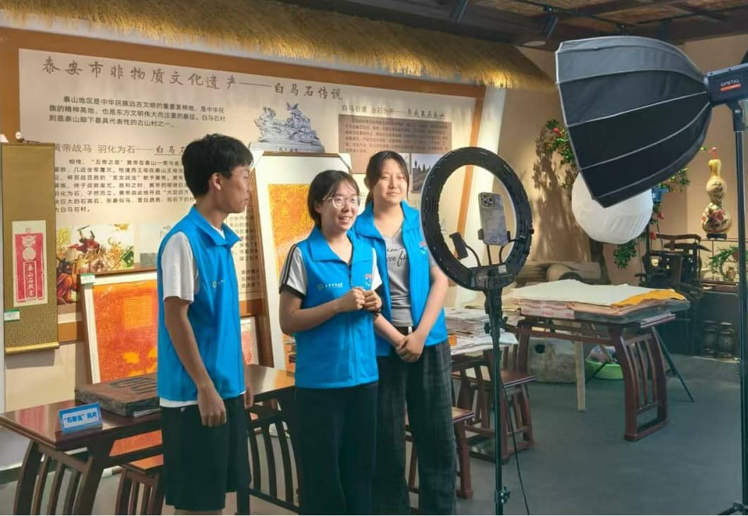 图为实践队队员在泰安烈士陵园向纪念碑敬献花圈。刘亚楠 供图直播讲解是大数据时代下人走进人民视野最便捷的方式,队员们结合展墙文字讲解历史脉络,现场演示拓印工具使用与纹样拓制过程,生动讲述非遗物件背后的红色故事,两小时内吸引近千人次观看。此次直播打破时空限制,让原本藏于乡村的非遗文化与红色记忆走向更广阔的大众视野,“原来非遗里也有红色故事”等留言刷屏,既激发了大众对地方文化的关注与探究欲,也让白马石村的历史文化名片广为人知,为文化传承与乡村文化振兴奠定了群众基础。