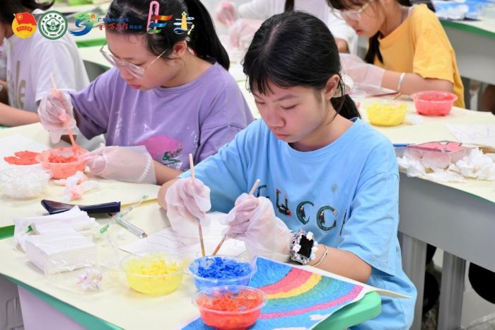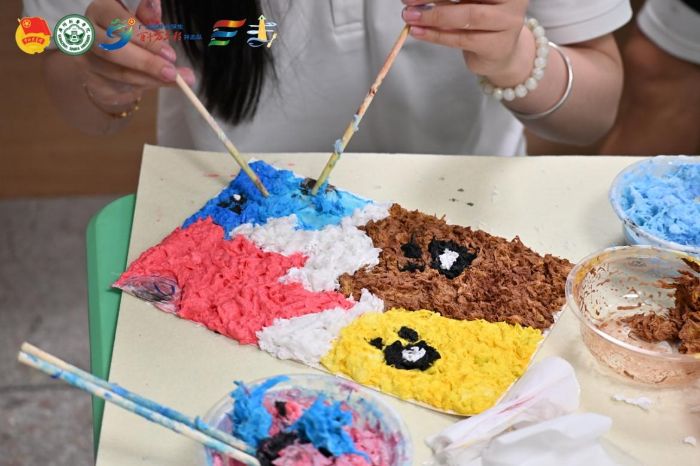 制作纸浆时,突击队队员戴小雨跟同学们讲解,“不同颜色的纸浆要分开存放,尤其是深色和浅色,否则容易串色,影响图案的清晰度。” 她还示范了胶水的添加比例,当胶水与纸浆的比例大概在 1:5时,既能保证粘性,又不会让作品干后起皱。” 孩子们听得专注,时不时点头回应,手上的动作也更加谨慎。
