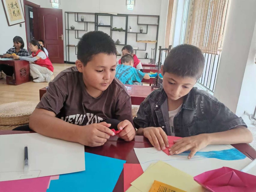 活动现场,志愿者还引导孩子们为作品添加细节,用彩笔绘制云朵、道路,为折纸建筑添加门窗装饰。通过近两小时的创作,二十余幅充满童趣的家乡主题折纸画新鲜出炉。志愿者将作品布置成展览墙,组织孩子们互相分享创作思路,在欢声笑语中感受家乡文化的独特魅力。