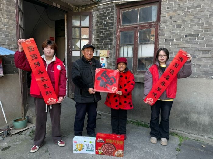 当天下午,在宣讲活动结束后,志愿者们带着提前准备好的慰问品,在社区工作人员的引领下一起前往拜访了社区内退伍老兵一家。面对志愿者们的热情关怀,82岁的郭夕富老人动情地说:“感谢组织一直惦记着我们,现在的生活越来越好,我们心里特别温暖。”志愿者代表送上准备好的慰问品,握着老人的手,叮嘱他要保重身体。老人还拿出珍藏的老照片,向大家讲述背后的故事,仿佛将大家带回了那个激情燃烧的岁月,志愿者们认真倾听老兵过去的故事,每一位志愿者都深受触动。拜访活动的最后,志愿者们送上了红彤彤的对联,寓意新的一年生活红红火火,送上对老兵生活最真挚的祝福。
